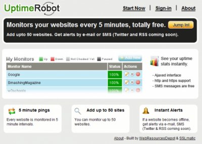 UptimeRobotUptimeRobot es una excelente aplicación online, que nos brinda la oportunidad de monitorear todas nuestras webs a plenitud, permitiéndonos identificar las probables causas de los problemas que pueda tener el sitio.